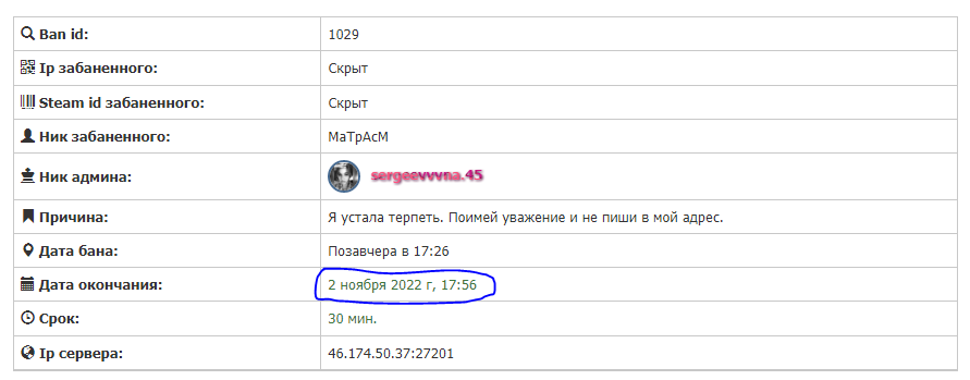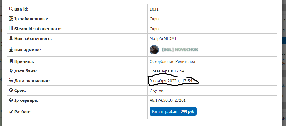 Обход бана,на скрине видно что срок 1 его бана на 30 мин должен был закончится в 17:56,после он сменил ник или что то типо того и начал там нарушать как я понял,и в 17:54 ему прилетает бан за оскорбление родных,темболее данный персонаж с привелегией