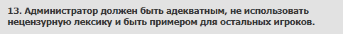 3. Мат и нарушение поведения Во время общения админ использовал нецензурную лексику что нарушает пункт 13 правил: "Администратор должен быть адекватным, не использовать нецензурную лексику и быть примером для остальных игроков."