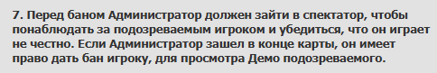 Нарушенное правило: 7. Перед баном Администратор должен зайти в спектатор, чтобы понаблюдать за подозреваемым игроком и убедиться, что он играет не честно. Если Администратор зашел в конце карты, он имеет право дать бан игроку, для просмотра Демо подозреваемого.